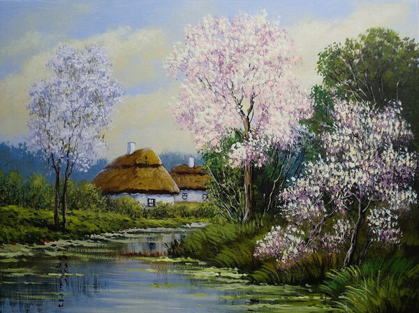 beautiful painting of old ukrainian village with pastoral landscape